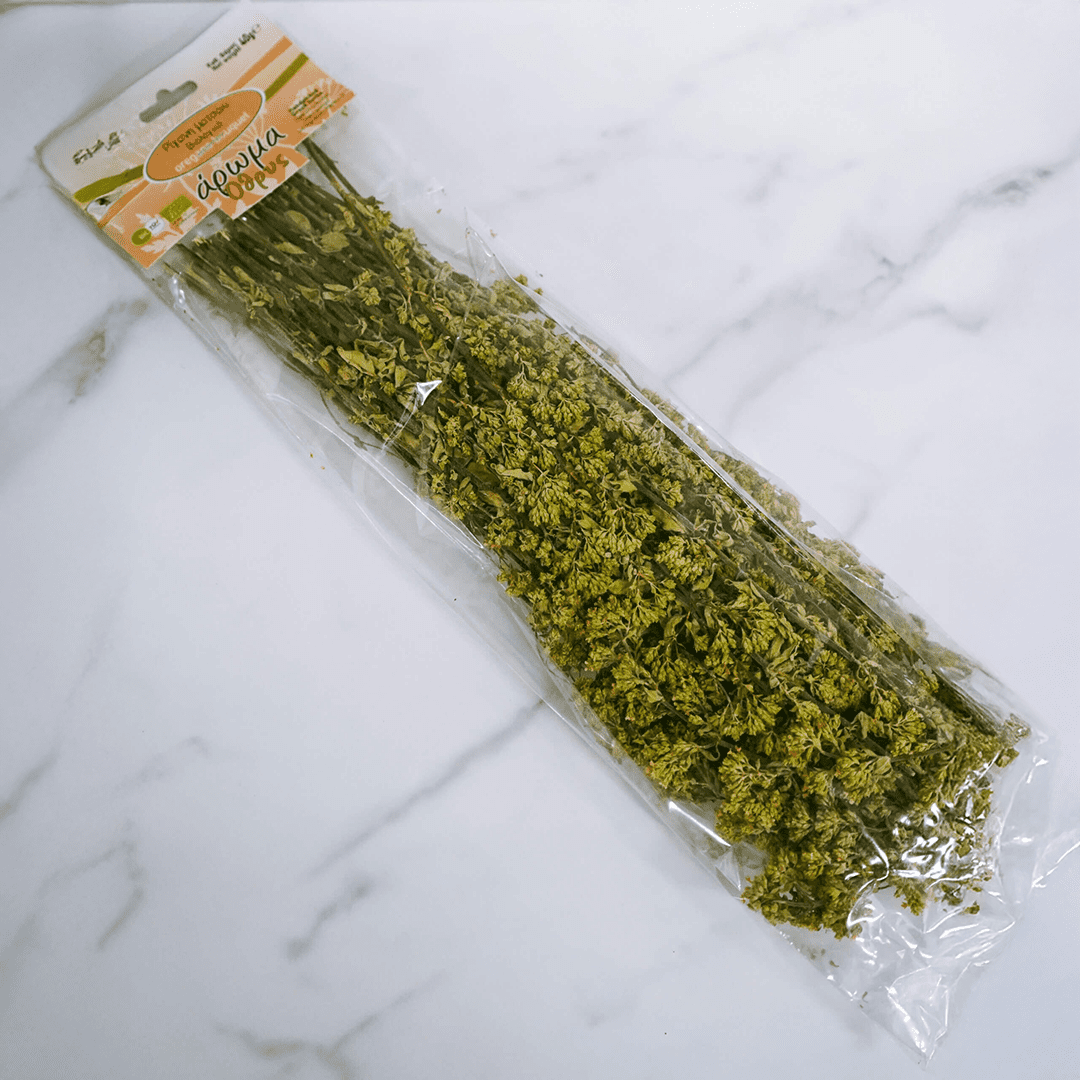 Fresh Greek oregano on the stem, bursting with flavor.